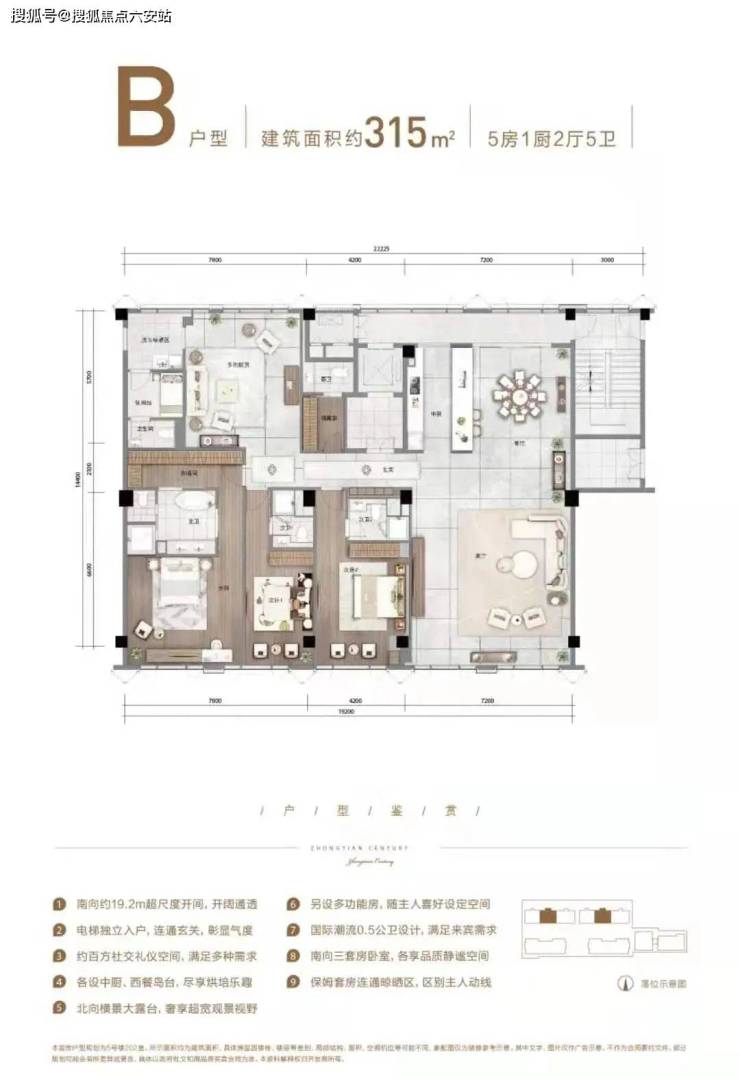 和市面上的其他宽景平层不同,HCC中天纪并没有在300多方的空间里规划出5-6个房间,而是保留了约100方空间作为公共社交空间,完全满足了商务、办公、居住等多重需求。由于公共社交空间被扩大了,因而整个房间的视野和采光面就被大大拓宽了。以C户型为例,四开间朝南,南向的总开间有近22米,西面还有15米的采光面。