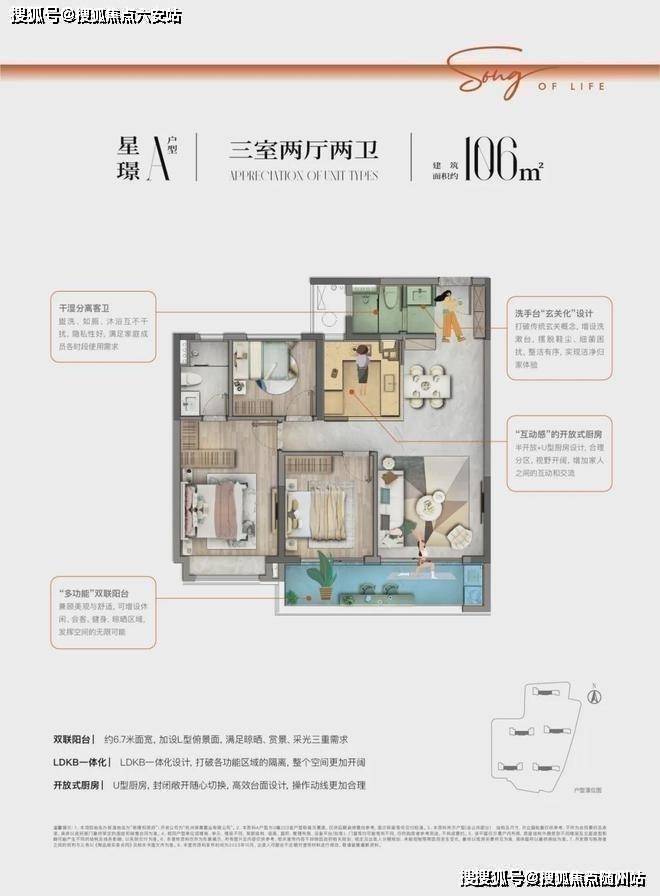 约106㎡户型点评:双联阳台约6.7米面宽,加设L型俯景面,满足晾晒、赏景、采光三重需求,LDKB一体化设计,打破各功能区域的隔离,整个空间更加开阔,开放式厨房 U型厨房,封闭敞开随心切换,高效台面设计,操作动线更加合理!