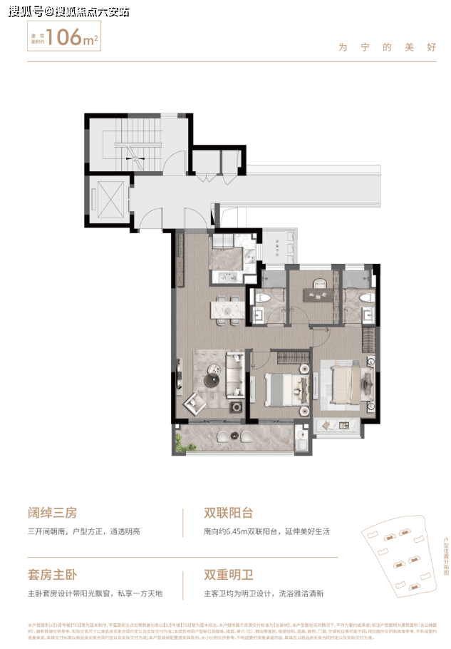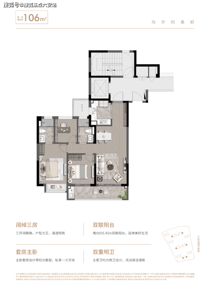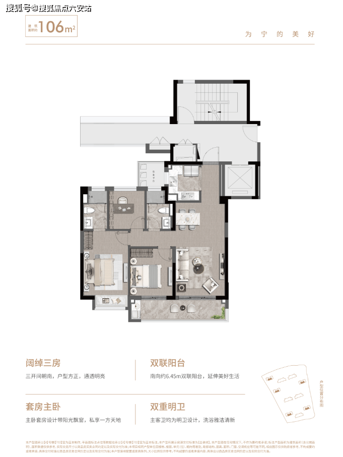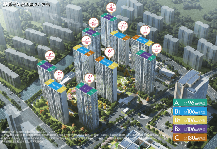 96㎡三房两卫:三开间朝南+6.2米观景阳台,得房率82%,主卧套房+独立家政间提升实用性。