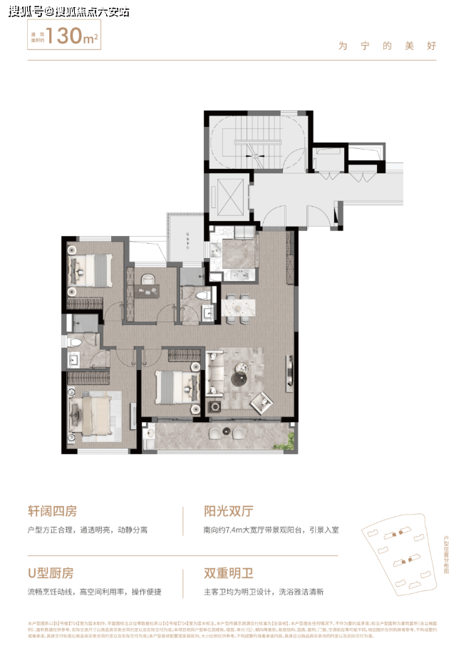 130㎡四房两卫:南北通透布局,6.8米餐客一体空间,独立家政区实现动线分离。