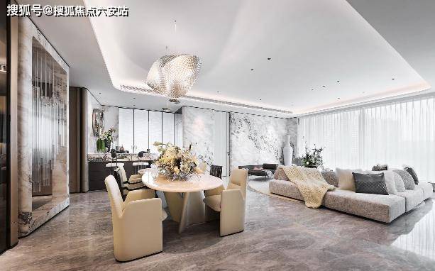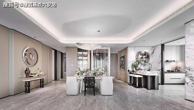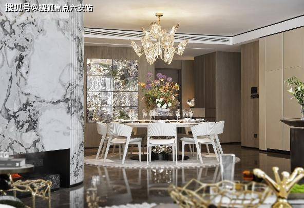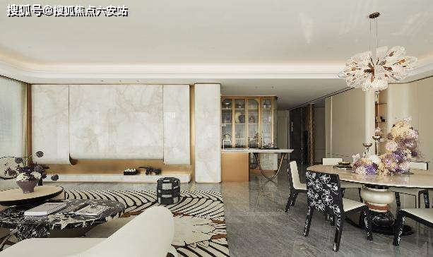 以香奈儿风为设计基调,打造的融合时尚魅力与现代轻奢的空间。从绿翡翠、芬迪白大理石到艺术玻璃与金属线条融合,带给空间柔和的包裹感,创造高级且浪漫的氛围。