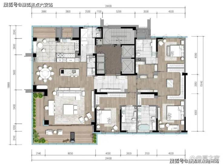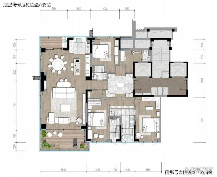 建面约160㎡户型,把“实用”玩出“奢感”,两梯两户,三室配了三卫,居中的一体化餐客厅超懂生活,几乎所有空间都利用到了实处。