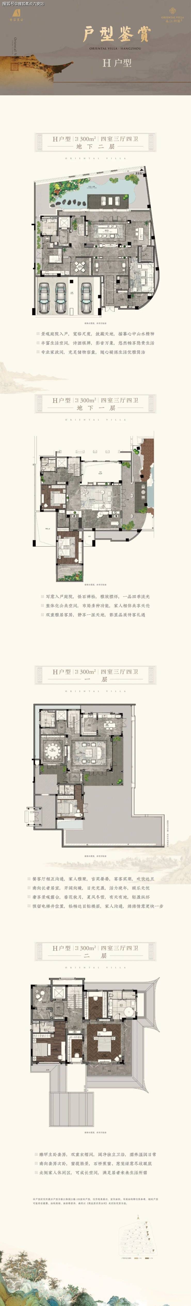 主力户型为170-320㎡中式合院,层高3.6-5.9米,地下空间可拓展至600㎡,打造“五重庭院”体系(地下景观庭、山水庭、露台庭等)。以320㎡楼王为例:
