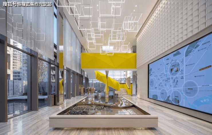 时而出现的镜面构成效果增加了视觉的趣味,将思绪拉入四维空间。沙盘区域空间高敞而明亮,灰色大理石与深色钛钢板,上空悬吊立体几何灯光装饰,片段式的黄色体块在空间的构成中反复闪现,呼应着空间的概念与主题。