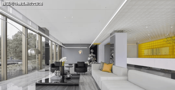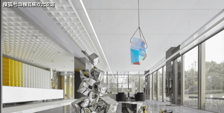 公共区域融合了艺术与工艺,反映着时尚的科技感与未来感。明黄色冲孔金属板在灰色铝板与石材的衬托下具有强烈的几何冲击力。画面的空间,排列着强有力的空间色块,故事也就从这展开。着重突出地面与雕塑的精致感。