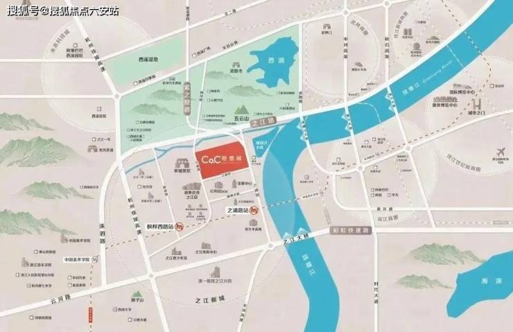 位置:位于杭州西湖区之江新城之浦路与之江路交汇处,宋城旁,九溪玫瑰园正南面,直面一线钱塘江景,背靠西湖群山