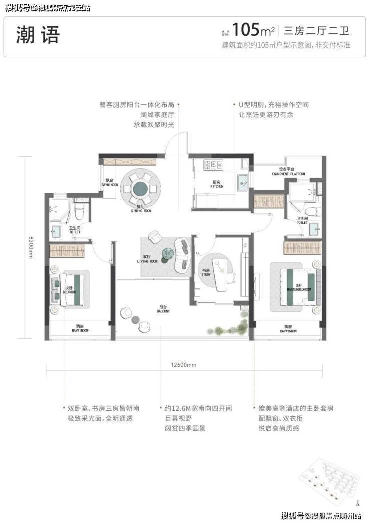 建筑面积约105㎡实现四开间朝南,约12.6米南向面宽,主次卧类双套房设计,颠覆市场对空间尺度的想象边界。