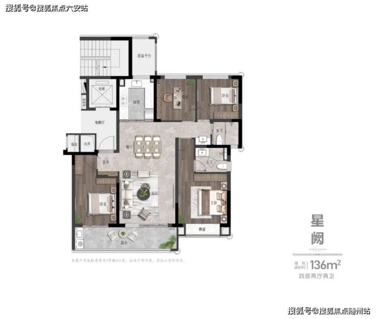 - **建面约136㎡(四房两卫)**: