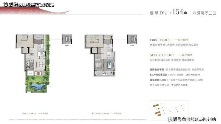 比如建面约170㎡的双层下叠四房两厅三卫,约9.7米面宽,三开间朝南的大四房格局。首层餐厅、客厅、品茶厅三个空间横向舒展,有机组合、互不干扰,单层就撑起了大平层的排场;窗外,还自带一个约9.7米宽的超大花园,满足各种野趣需求;二层是3个房间朝南,奢配约5.6米大阳台,两房联动,舒适自然。