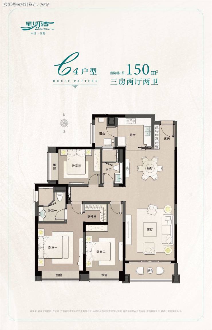 三房两厅两卫,约150㎡