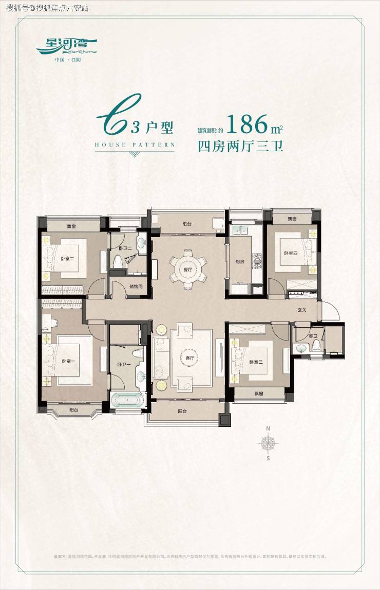 四房两厅三卫,约186㎡