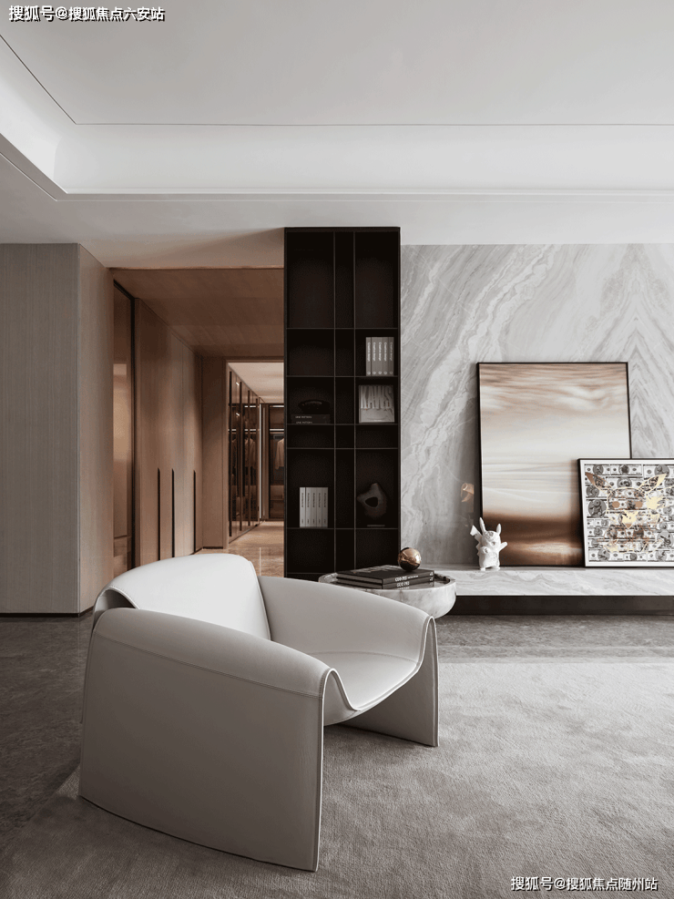 客厅在多重材质的组合下,顺畅融汇 秩序井然素雅的基调来自比例的精准把控和色彩的考究搭配,克制之间彰显出游刃有余的平衡之道!电视背景墙利用石材自身纹理,将水光潋滟的迷人景象引入室内,沙发后方的展示柜高低错落线条置于其上,玻璃和金属交融出迷濛光影!