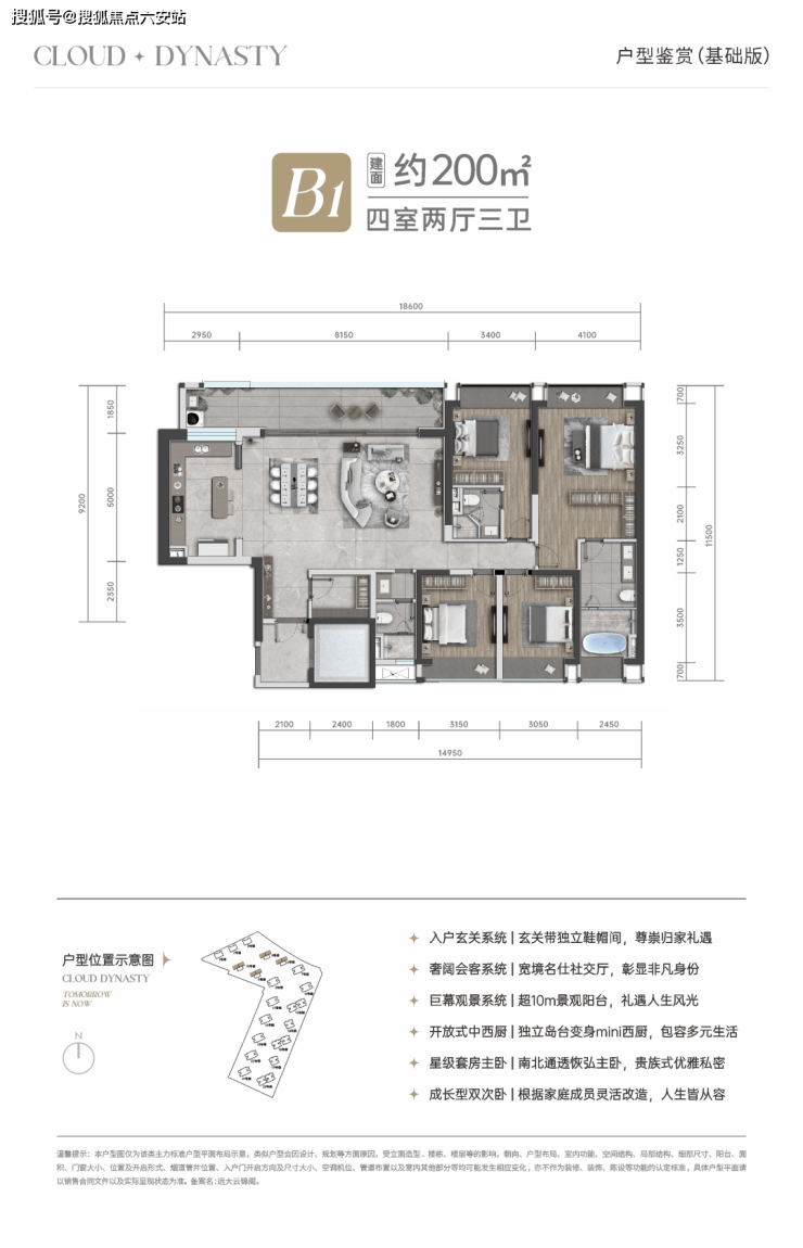 • 169㎡经典云端大宅:4梯2户配置,LDKB一体化客餐厅,主卧双台盆+独立衣帽间,满足四代同堂品质需求。