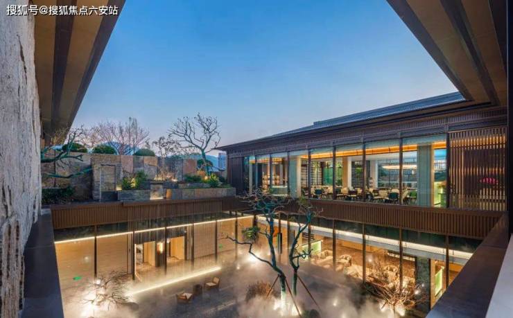 穿过景墙是下沉水院,连着售楼大厅和松林剧场,一边是水瀑潺潺,流淌成一幅古雅的宋韵山水画卷,一边是肆意舒展的罗汉松、老红梅、羽毛枫,铺展出悠远的东方意境。