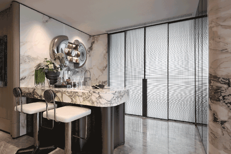 颇为有趣的是,不同大师设计的不同主题空间,承载着不同的审美与品位。处处可见圆润优雅的细腻设计,再加上芬迪白、普拉达绿大理石,呈现雅致高贵的气质。