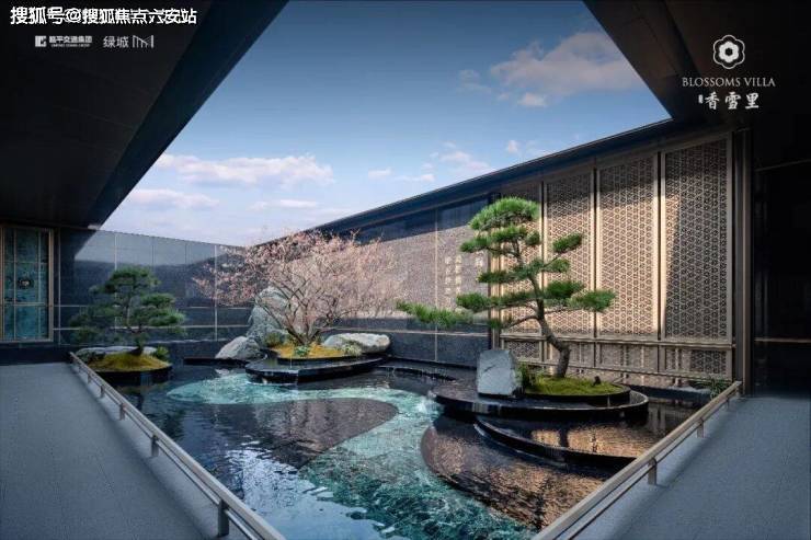 园林景观上,项目以“一轴一带八景十巷”为骨架,构建多进式园林体验。入口处对景墙以亚马逊绿奢石镶嵌金石,刻绘项目Logo与六瓣梅花图腾,形成一道视觉上令人赞叹的风景线。下沉庭院中,光影交织,潺潺流水映照婆娑树影,挺拔树姿注入向上生机,拉近建筑与自然的共鸣。镜面水庭倒映重檐飞角,与庭院景观相映成辉。