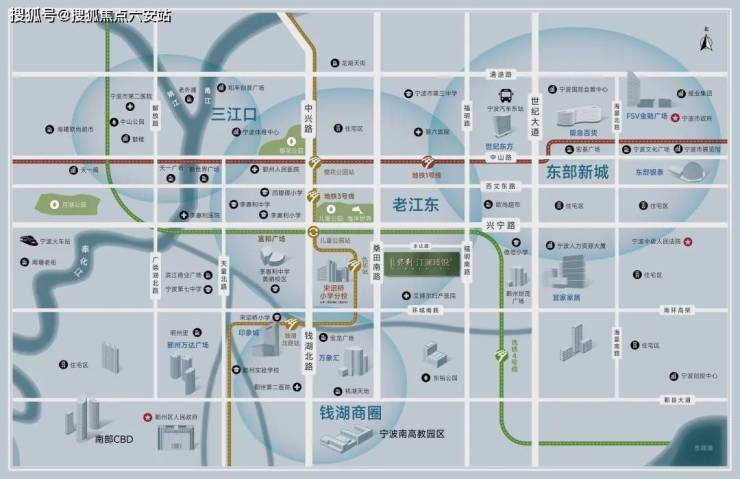 项目位于老江东、鄞州核芯与东部新城CBD交汇处,直线距离东部新城仅2.5公里,坐享千亿级城市配套。