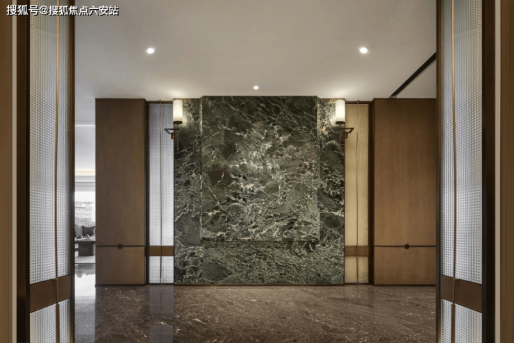 以350㎡户型为例,玄关背景采用“森林绿”。以一整面森林绿大理石背景墙做视觉隔断,搭配两侧艺术造型的皮革硬包,观感上既没有大面木质隔断的厚重,又不失新中式应有的华丽。