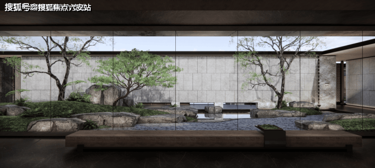 这还只是序曲。再往里走,就来到了社区会客厅——江岸望山,灵感取自倪瓒的《江岸望山图》,作为项目内最大的草坪,在这里可以会客、赏景、品茗,享受东方园林特有的松弛感。
