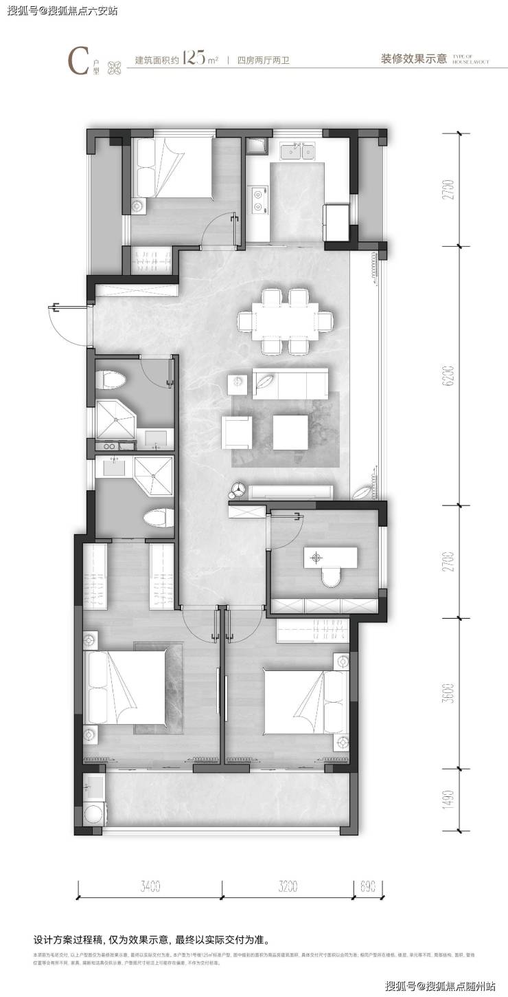 125方-舒适四房|南向双开间阳台,餐客厅大面积飘窗,主卧套房设计