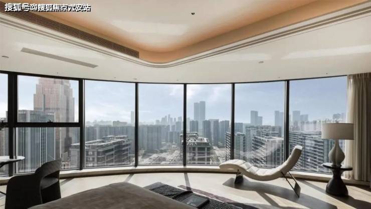 是全杭州唯一的三叶草立面弧度的大平层,实现了真正的270度采光,一层三户没有绝对的东西边套,每一套都是全边套设计。这样不同阳光的角度下,深蓝色大面积落地玻璃映照着金属线条,又有着不一样的景致,而且采光毫无死角,窗外如此盛景