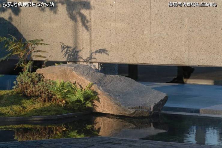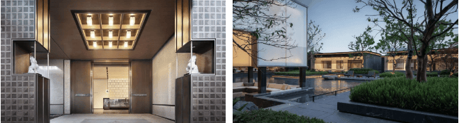 建筑整体方正硬朗、沉稳大气,两侧搭以朴树和精致花境,营造充满东方美学的礼序入口。视觉中心处,山石横卧于水景之上,与泮池砚台相映成趣。长砚迎宾,赋予归家礼仪的尊崇感。
