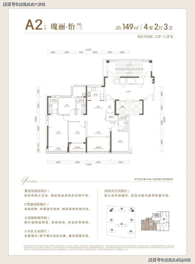 但尺度和功能性一点都不含糊:四开间朝南、独立玄关、U型厨房、1+N社交厅、储藏室、封闭生活阳台。尤其是双套房的设计,无论三代同堂或二孩家庭,都能从容生长。