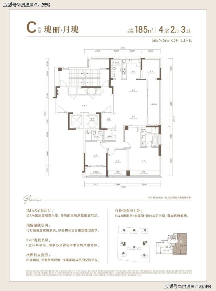 建面约185㎡则升格成行政级主卧套房、270°观景书房以及独立储藏间等功能,为未来十年的改善生活留足弹性。