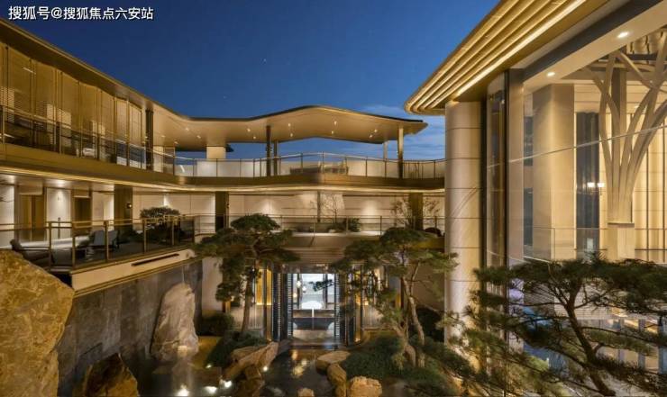 这是第二重庭院,它描摹的是中国宋代山水神作《溪山行旅图》,但是跟《溪山行旅图》不一样的是,它不止可以远观,还可以参与其中。无论你走进下沉式会所的恒温泳池、健身房、会客厅……或者是在挑高约12米的斗拱之下、室外连廊之上、下沉式庭院之中,你都可以在不同的角度,欣赏它的千峰万壑。