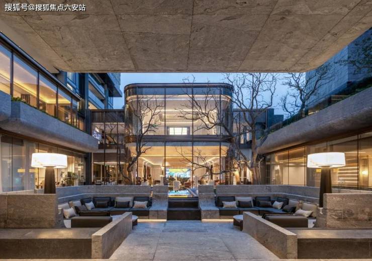 当你站在挑高约12米的入户大堂穹顶之下,眼前扑面而来的就是一个三层楼高的下沉式庭院。里面用层层叠叠的太行金石,造出的一片「悬崖峭壁」,造型各异的油松和红枫点缀在不同高度的山崖之间;高达约15米的飞瀑从中倾泄而下,仿佛是把「飞流直下三千尺」的场景搬进了现实,底下高低不同的小瀑布,又给整个庭院水景拉出了更丰富的层次感。
