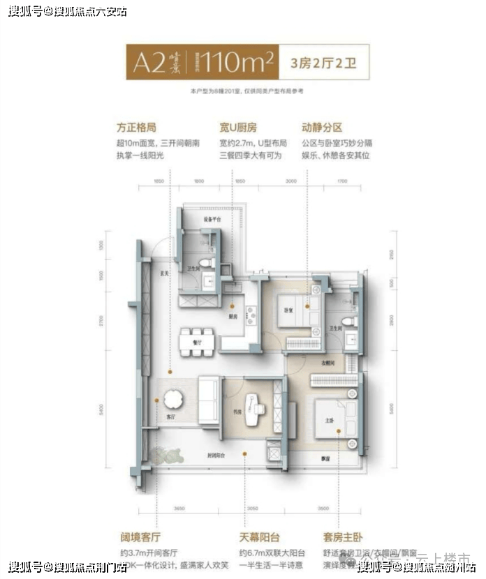 110㎡户型主打 “超 10 米采光 + LDK 大通厅”,空间感瞬间升级。餐客一体设计让聚会时的喧嚣与杯盘狼藉都能轻松容纳,厨房收纳系统更是 “家宴神器”,锅具餐具能实现 “秒归位”。约 3.7 米开间客厅与 6.7 米双联大阳台连通,一半用于晾晒生活,一半可打造成孩子的 “秘密基地”,实现 “生活与诗意” 的分区。