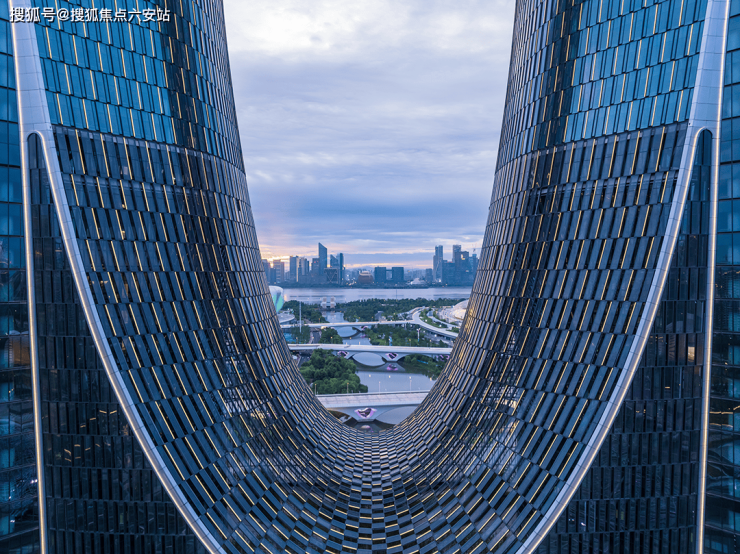 源取自然界“悬链线”和“抛物线”的设计理念,将双塔中间钢拱连廊塑造成柔和的马鞍型,最大跨度达80m,最大竖向悬垂高度约65m,平面宽度约60m,是整个项目设计施工难度最大、技术最复杂的部分,也是目前亚洲范围内已建成的最大悬垂屋面。远远看去像一条巨型项链被自然悬挂在两座塔楼中间,为大楼的刚劲气质增添了一丝柔美韵律。