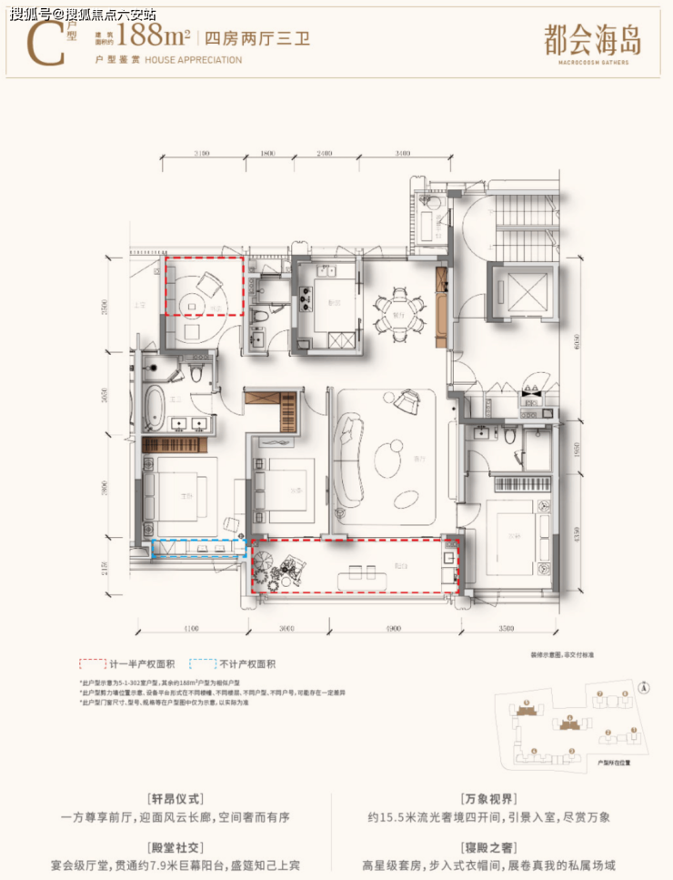 在产品上,创新公园式尊崇归仪,汲取迪拜“金相框”灵感,匠造鎏光艺术金顶,勾勒环幕四面屏,定鼎城市封面美学;凝萃海岛度假风园林,升级滨江新一代蓝宝石水池,全维风雨连廊设计,并高定恒温泳池会所&多元架空泛会所,户型上以全周期改善为定位,堪比奢侈腕表的精细雕琢,勾勒出建筑面积约139-188㎡高定府邸。