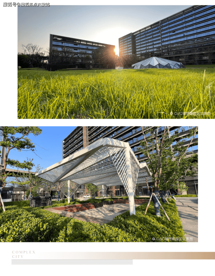 园区高颜实景也是亮点满满,“超流体”立面线条熠熠生辉,铝板+大面积玻璃融合相交,呈现出极简又富有质感的立面美学。园区修剪精致的园林植物与建筑交相辉映,大面积绿地阳光草坪、钻石之心等折叠景观,带来扑面而来的度假感,在繁华密林中给予生活最简单理想的诗意,带来更富想象美好生活。