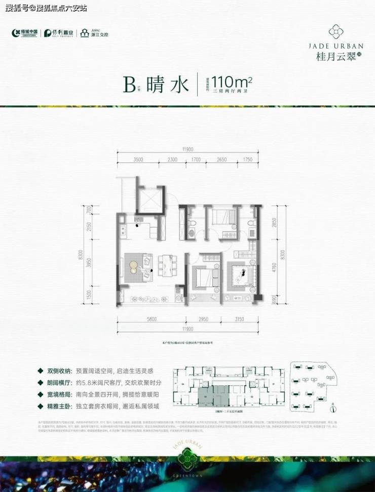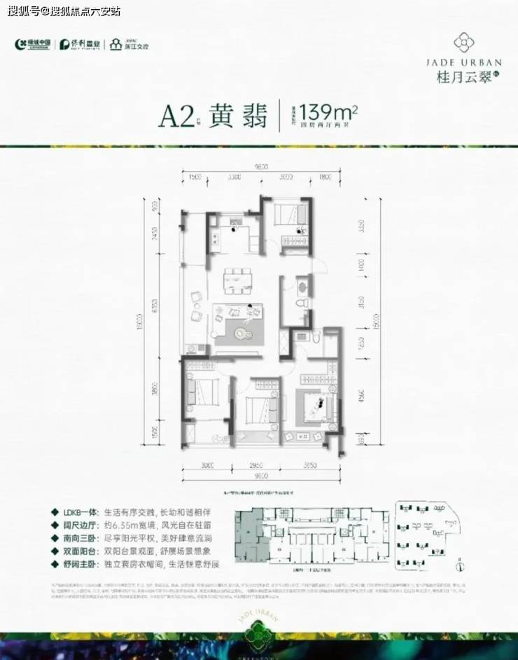 A户型:约139㎡户型,四房两厅两卫,三开间朝南,全明边厅设计,大横厅带大阳台,采光视野好;三个卧室均朝南,带阳台或飘窗,面宽大、采光好;主卧大套间、阔绰收纳空间。是绿城过往的项目中难以见到的。餐客厅一体,连带一个约6.35m左右阳台,景观视野堪称一流。