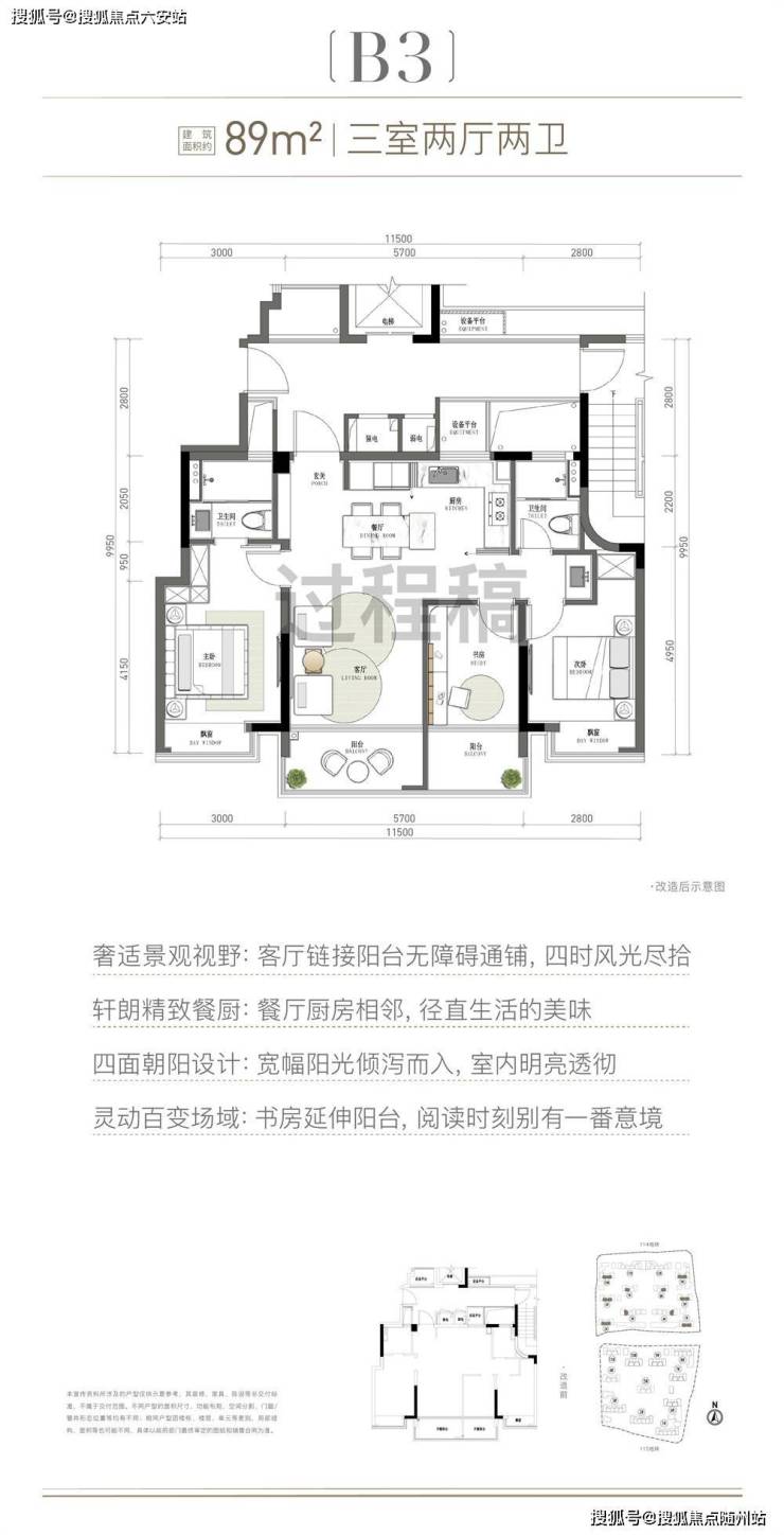 建面约89㎡户型实现四开间朝南,南向面宽约11.5米,媲美市面120㎡产品。三室两厅两卫格局,采用LDKB一体化聚厅设计,南向书房可与客厅打通形成5.7米超方厅,主卧套房配备飘窗,得房率约91%。