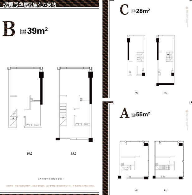 户型设计:29-55㎡双钥匙/LOFT,主力39㎡户型,买一层享两层,得房率高达200%,部分赠送4-6㎡阁楼。