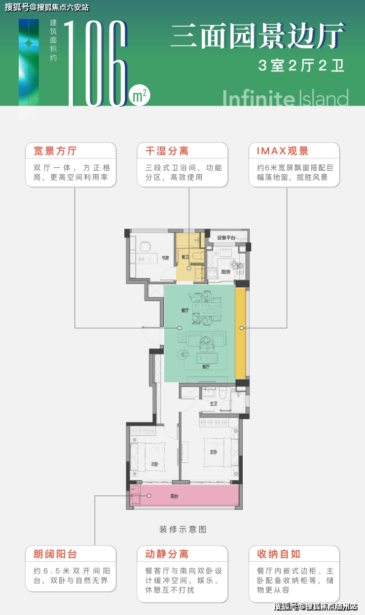 建筑面积约121平方米的创意样板间,则充分利用边户大横厅的拓展性,一进门便是餐客厅一体带飘窗,视野开阔,尽显大气。