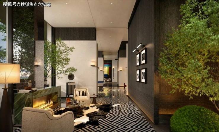 首先,大门处打造了一个“水上”迎宾通道,灵感源自曼谷嘉佩乐酒店和纽约安缦酒店,在长约150米的恢弘界面上,顽石、叠水、绿植、艺术雕塑高低错落分布,还有一面叠瀑从建筑立面里垂延出来,气派十足。