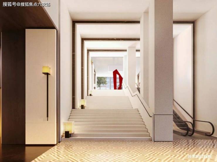 其次,沐芳洲整个项目向上举起了约3.8米,创造出一座漂浮在空中的生活岛屿。从地面G层上到平台架空层,可以选择自动扶梯或者台阶向上,乳白色如同通往圣殿般的台阶颇具艺术感。