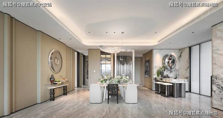 东区建面约320户型,将艺术感进一步融入日常中。特别设计的专属门厅空间,是从电梯厅延伸到家,如同一处艺廊,放慢人的情绪;室内选用了浅金色奢石(外界也称其为“芬迪白大理石”)作为主要的石材,曲面的木饰面也为浅色,整体给人以明亮感。