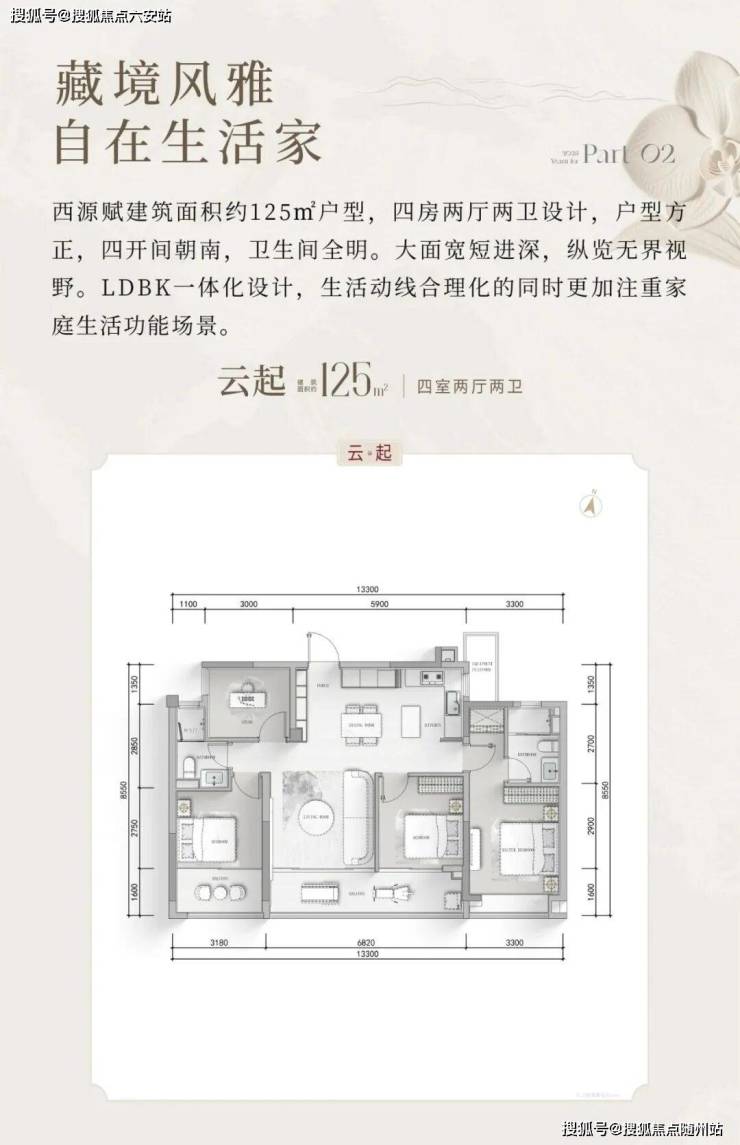 建面约125㎡户型:约6.8米阔景观阳台延展生活视界,将四季风光引入日常;LDKB一体化宽厅设计,打破空间边界,营造通透敞阔的社交场域;南向约13.3米面宽,纳尽阳光清风,光影随心而动。