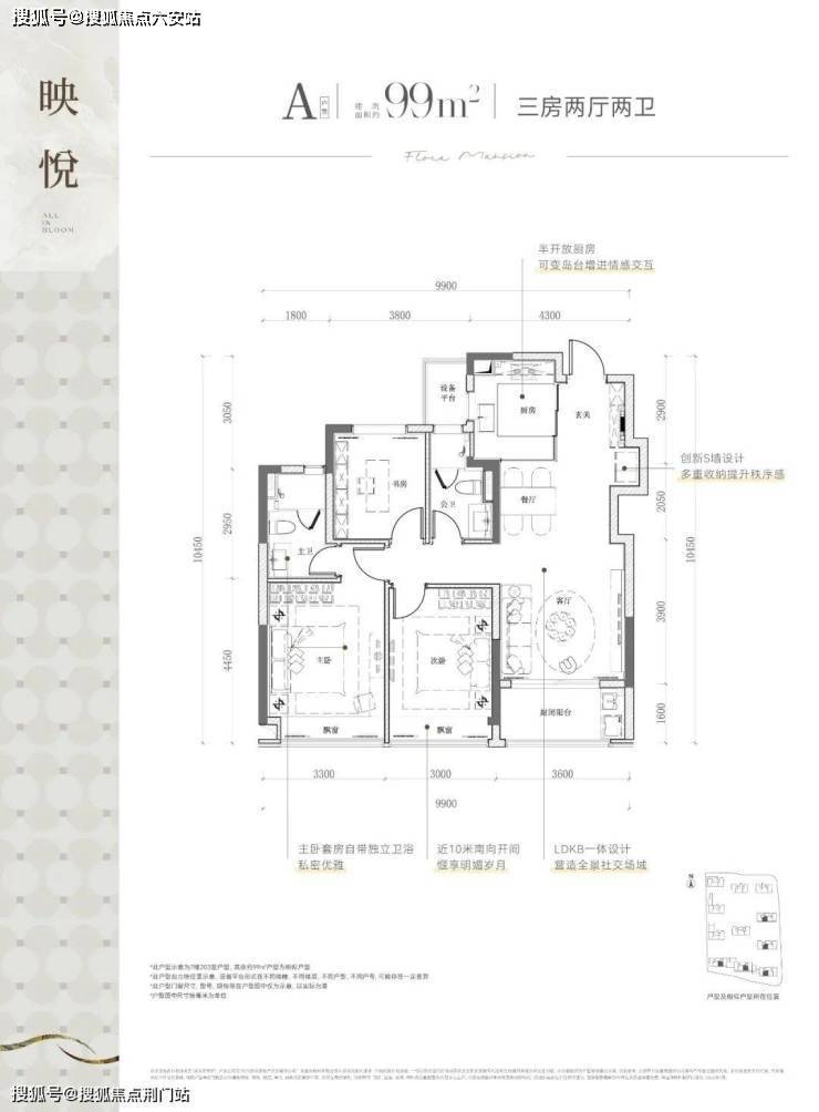 建面约99㎡的三房两卫户型,动静分区,采用三开间朝南设计,还可以放下双开门冰箱哦~配备双飘窗和大阳台,保证了室内通风明亮,同时两个卫生间的设置,解决了早上排队使用的问题。
