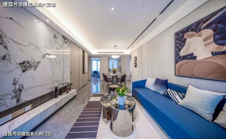 更加出人意料的是,翠栖府在客厅配置了“双背景墙”——电视机背景墙+沙发背景墙,其中电视机背景墙是大片岩板上墙,而沙发背景墙则是硬包的形式。