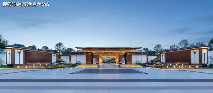 比如这一次的“建发式”大门一如既往,南北地块做了双大门设计,门头宽度达到约61米(含景墙)。入户做足了仪式感:重檐悬山式门楼、芝麻黑石材地雕、“鱼跃龙门”御道,两侧伫立着石狮、影壁、跌水、绿岛......还有两株精挑细选寓意“财富与健康”的罗汉松。