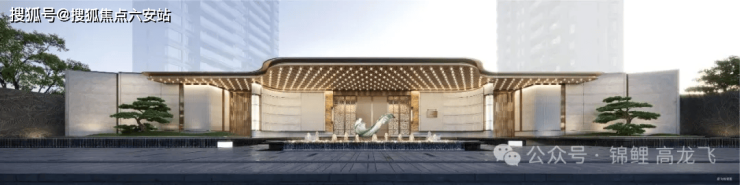 约60米超尺度入口搭配“潮涌钱江”鎏金雕塑,香槟金铝板立面融合钱塘江交叉潮意象,打造板块第一视觉地标。