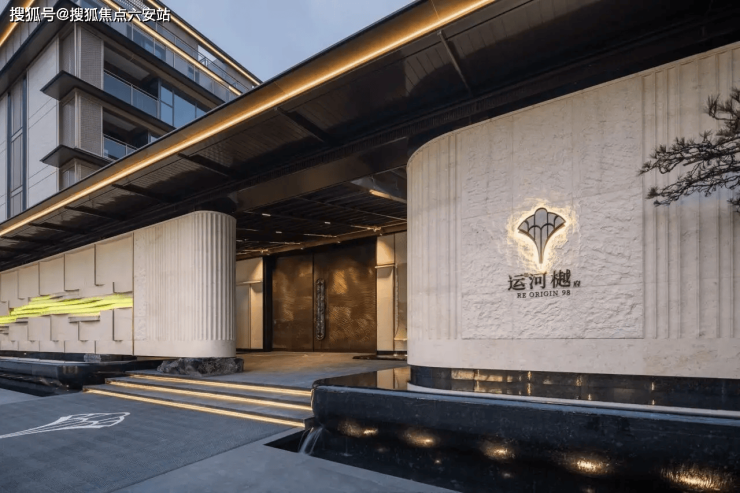 运河樾的园林感,几乎从门头就开始了:贯穿的水系、奢石景墙之上的玉石飘带,都像是把运河的水给引了过来,再配上金色的坡屋顶,很有江南院落的雅贵气质。