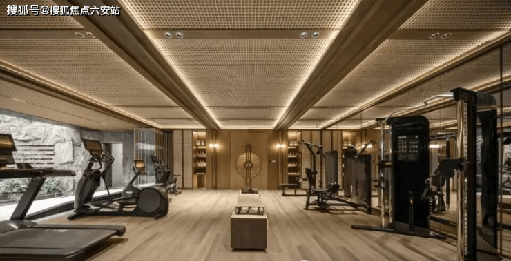 不止,每层园林都连着会所配套,既有通高12米的会客厅,也有嵌在「松林崖壁」之间的私宴厅,还有能和庭院融为一体的健身房。
