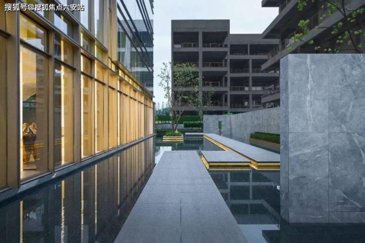 入口转折后,进入一面素净的水院空间,镜面水景紧紧包围建筑,大面的玻璃幕墙倒映于水面上,室内外空间边界变得模糊,彼此梦幻交融、无限延伸。