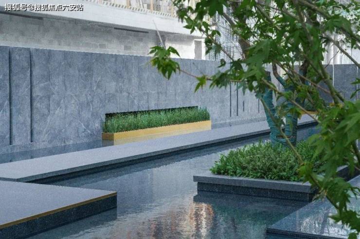 简洁明朗的园路,漂浮穿行于水面,步道间精心点缀几颗景石、漂浮树池及悬挑跌水,无意间演绎了具有现代气质的西湖写意。建筑立面肌理在景观平面上延伸,模块化的条状灌木与砾石带、水景交相错落。强烈的几何构图体现一种秩序与规则之美,灵巧的错位布置又不失活泼,与外围的绿色草坪形成对比。